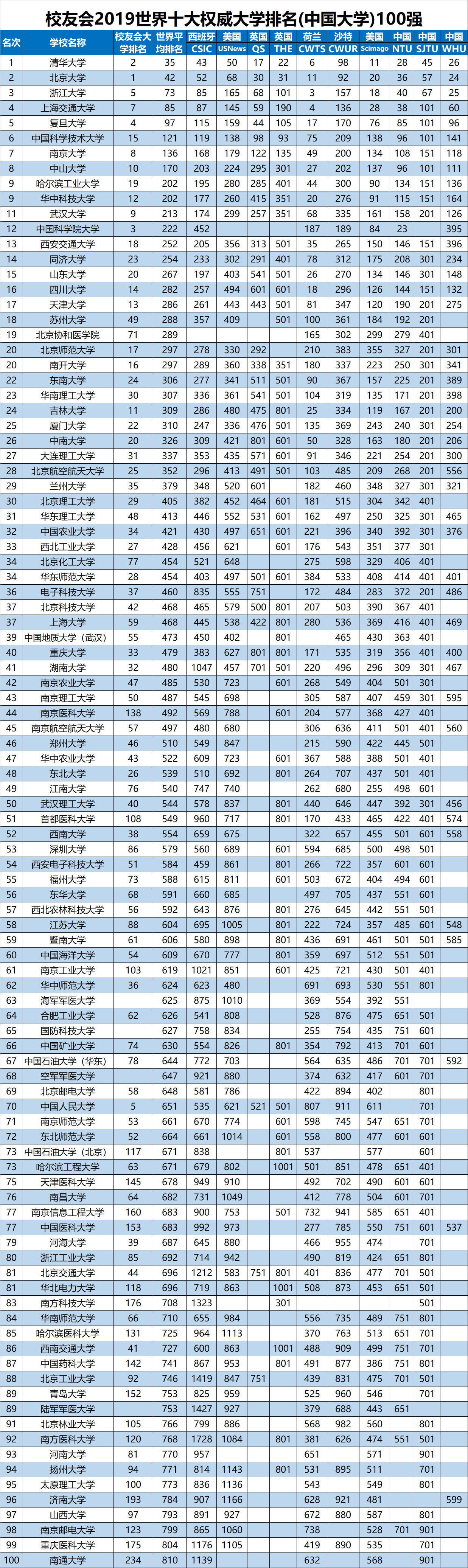 2019年5月22日,艾瑞深中国校友会网(Cuaa.Net)首次公布《校友会2019世界大学排名分析报告》,报告依据2018-2019年英国QS、英国THE、美国USNews、美国Scimago、西班牙CSIC、荷兰CWTS、沙特CWUR、中国NTU、中国SJTU和中国WHU等全球公认的世界十大权威大学排名中国高校排名结果,最新发布校友会2019世界十大权威大学排名(中国大学)和2019世界十大权威大学排名(中国各类型大学)等系列排名,旨在为2019年全国高考考生高考填报志愿、中国高校“双一流”建设评估提供参考指南。