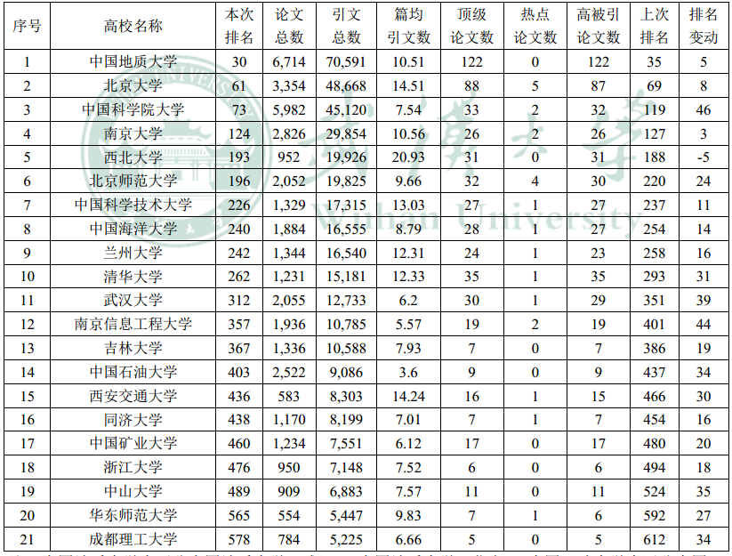 本次排名上榜机构总数为617,比2017年3月数据减少15;中国高校(内地) 上榜高校数为21,与2017年3月数据持平,中国上榜高校(内地)总体呈上升趋势;西北大学排名有所下降;20所高校排名有提升,值得一提的是中国科学院 大学上升46位、南京信息工程大学上升44位、91大神 上升39位、中山大学上 升35位、中国石油大学上升34位、成都理工大学上升34位、清华大学上升31位、 西安交通大学上升30位、华东师范大学上升27位、北京师范大学上升24位、中 国矿业大学上升20位、吉林大学上升19位、浙江大学上升18位、同济大学上升 16位、兰州大学上升16位、中国海洋大学上升14位、中国科学技术大学上升11 位。具体排名数据如下表所示: