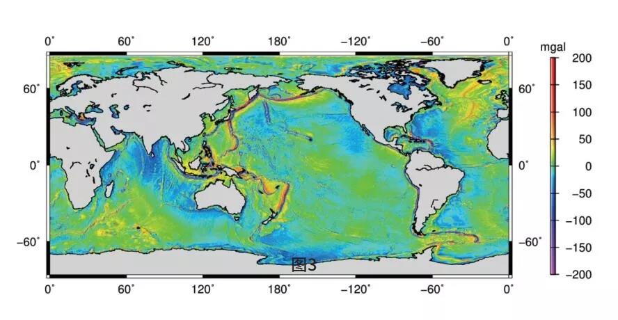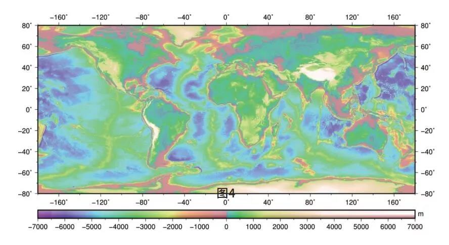 2.创建了自主的精细海洋重力场和海底地形反演技术体系,解决了近岸数据质量差、计算效率低等难题,构建了1′×1′全球海域重力异常(如图3)和海底地形模型(如图4),精度与国际权威模型相比,重力异常在中国近海优于EGM2008和V23.1,海底地形比ETOPO1提高10-30%,为我国填补了大面积海洋重力和地形数据的空白。