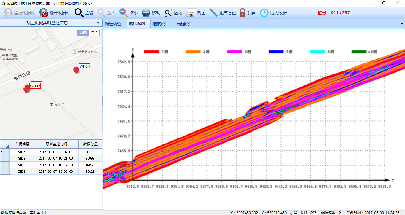 “基准站通过特种电台将有关数据传给碾压车,碾压车实时定位,并通过3G/4G网络将实时数据上传到数据服务中心,由数据服务中心分发监控数据到各个项目部监控中心,实现对碾压过程的全程监督。” 6月7日,在武汉江北快速路工程施工现场,工程业主单位航发集团有关负责人如是说。