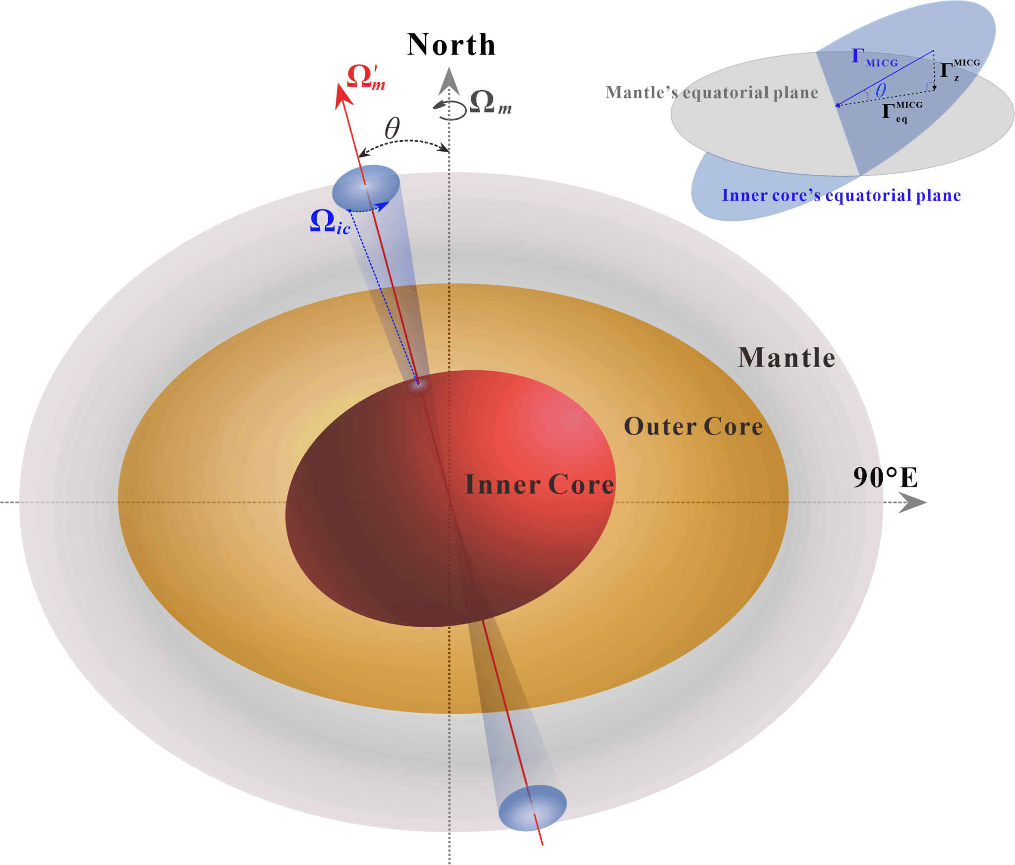 地球极移/日长中可能存在不同的十年、亚十年尺度的周期性变化。由于可用数据长度有限且信号相对微弱,如何准确探测出这些周期性变化是一项极具挑战的工作,而如何进一步解释这些变化的物理成因更是国际性难题。利用团队成员早期提出的z域谱分析方法--AR-z谱(如图1),团队在2019年首次发现日长变化中存在一个约8.7±0.2年的周期性信号(Ding, 2019 EPSL),但未作进一步解释。随后又在极移变化中观测到几乎相同周期的信号,并建议其为可能的内核晃动信号,这也是国际上第一次找到内核晃动的可能信号(Ding et al, 2019 GRL)。在最新的研究中,团队首先确认了早期在极移中所建议的信号确实为内核晃动信号,且通过进一步分析极移和日长中约8.5年的时变特征,发现它们具有很好的一致性,理论上应来自于相同激发源。地球自转理论采用2-D地球模型,假设内核自转轴与地幔自转轴重合,所以内核晃动信号只可能出现在极移分量而不可能出现在日长分量中;而实际高度异质的3-D地幔的2阶0次形状(“扁”)在内部具有很大的不确定性,对称轴也会发生变化,尤其是核幔边界处,而异质的(下)地幔又会对内核进行塑形。基于此,团队构建了一个内核自转轴与地幔自转轴存在微小倾斜的模型(如图2所示),也即内核存在一个~0.17°的静态倾斜,发现该倾斜可完美解释观测结果。这也是国际上首次由实证证实内核存在静态倾斜。除此之外,所探测的内核晃动信号周期可直接用于约束地球内外核边界处的密度跳跃,该跳跃值也是地学基础研究中一个仍未被很好确定的参数。