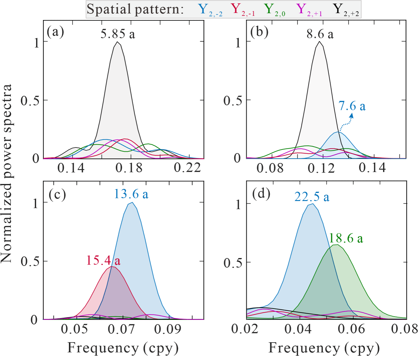 图2. 利用最优序列估计方法从地表地磁观测中探测到了7个周期性信号及其对应空间运动模式(也即对应的球谐阶次)。 (来自: 丁浩 自绘)