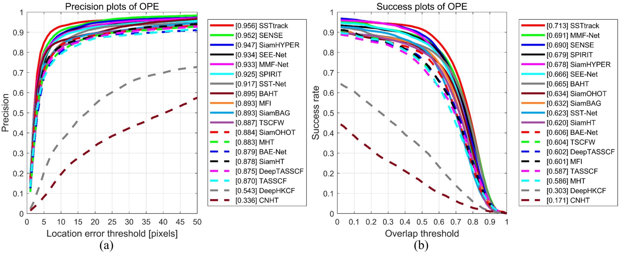 图 4. 不同跟踪方法定量比较结果(a)跟踪精度比较,(b)跟踪成功率比较