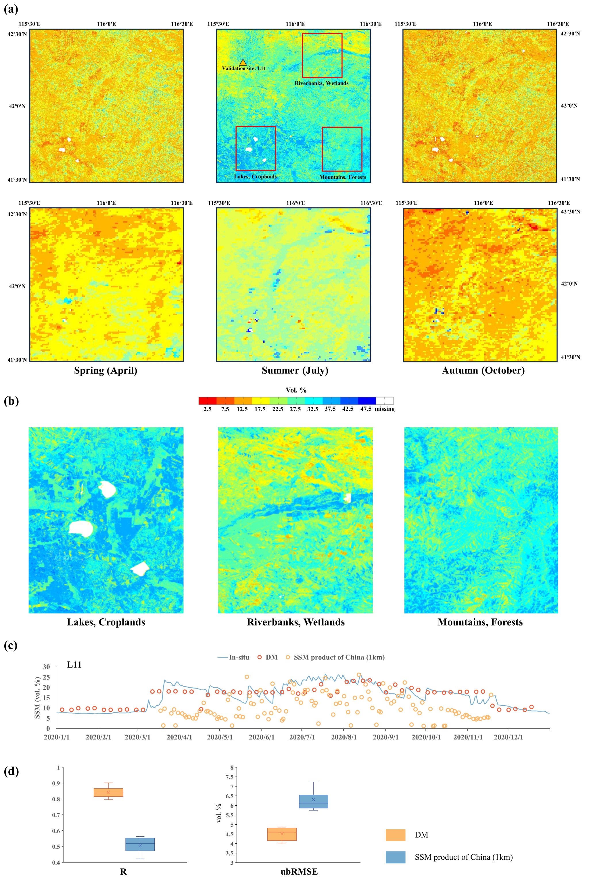 图3.滦河研究区可微分模型10m分辨率土壤湿度反演与1km分辨率土壤湿度产品的空间分布、时间序列与反演精度对比图