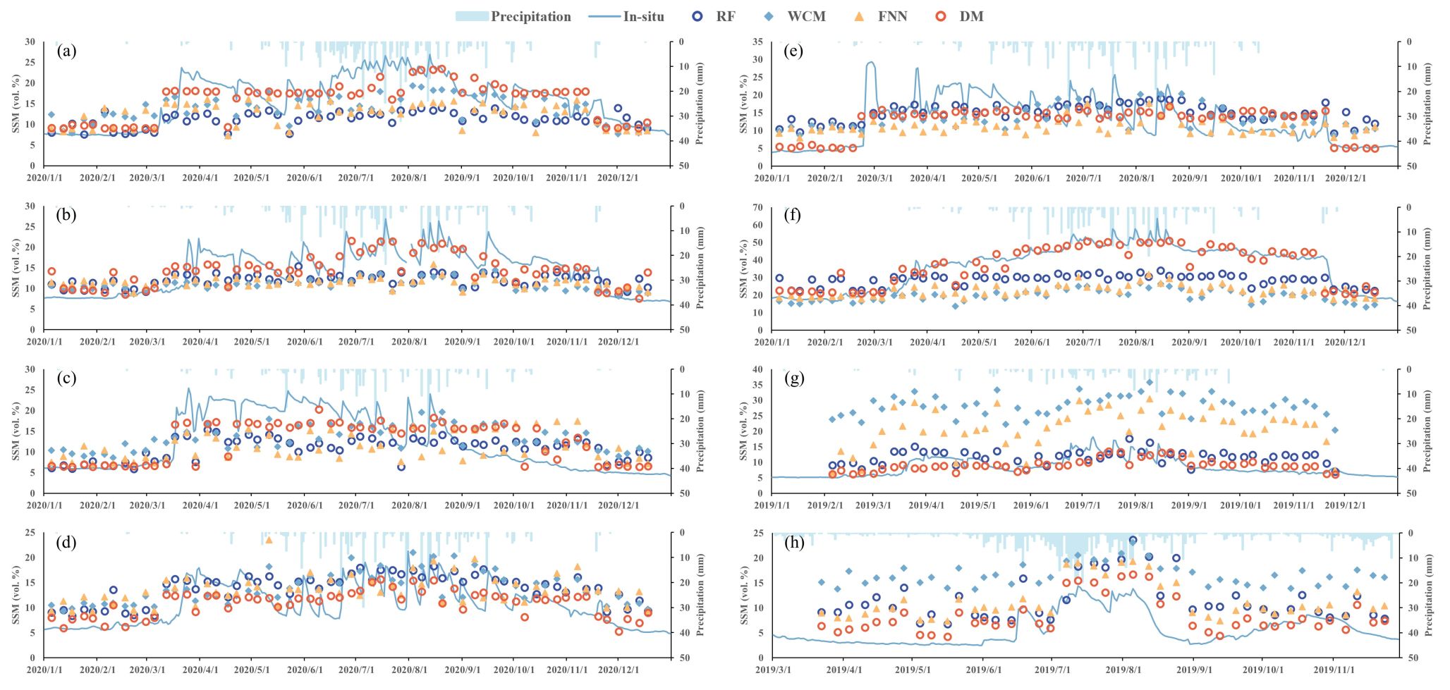 在同其他物理模型与机器学习反演模型(水云模型(WCM)、RF、XGBoost、GRNN和FNN模型)的对比评估中,可微分反演模型在反演精度、空间外推能力、泛化能力等方面都更胜一筹。此外,可微分反演模型可以很好地捕捉土壤湿度变化(如图2),并且在高植被覆盖度、稀疏样本区域都展现出色的反演能力。可微分反演模型有效结合了物理和机器学习模型的优势,在研究区域内提供了高精度高分辨率的地表土壤湿度估计(如图3),同时,其强大的泛化能力也为全球尺度的高空间分辨率地学参量反演提供了借鉴。