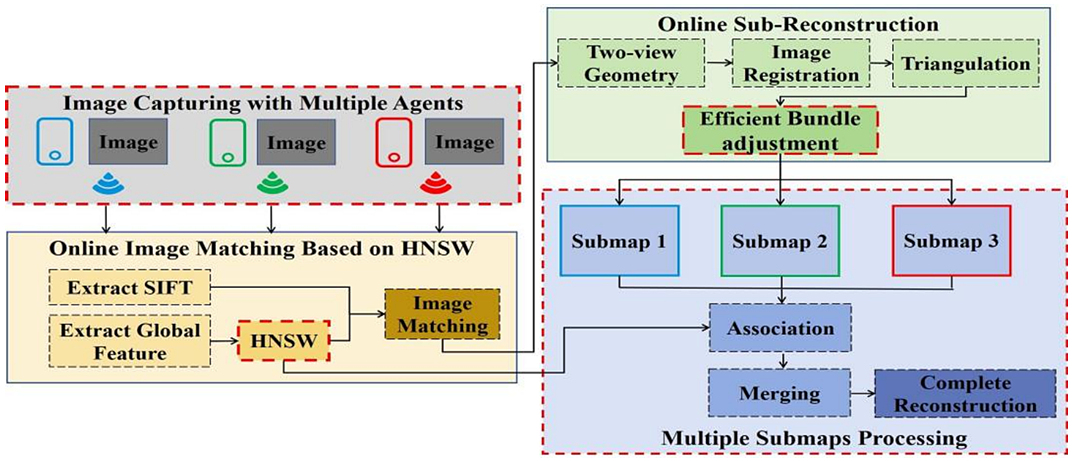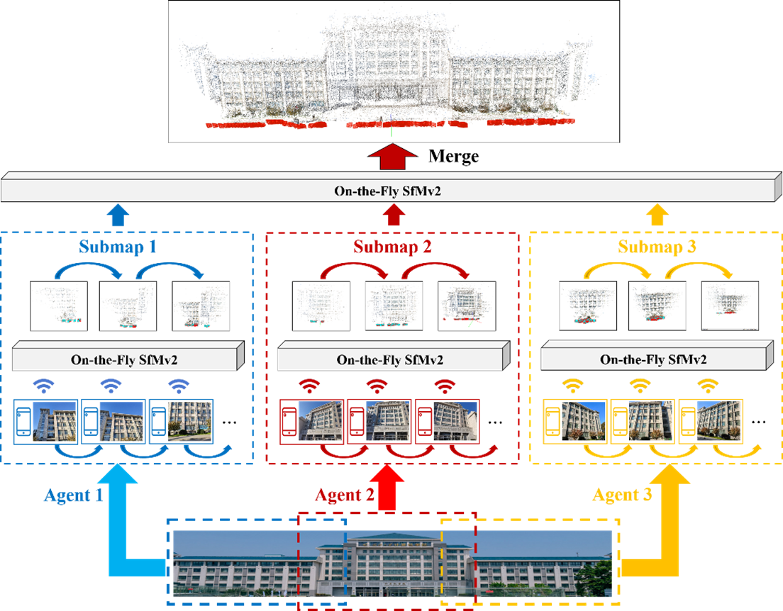 针对上述问题,研究团队提出on-the-fly SfM:一种面向多代理并发式的高分辨率无序影像准实时SfM稳健处理框架,实现了“任意拍摄-实时图传-在线处理”。该框架主要由支持4G\5G的多代理影像采集与图传、基于HNWS在线影像匹配、融合分层结构树的自适应带权局部光束法平差、在线子地图重建与融合等模块构成。
