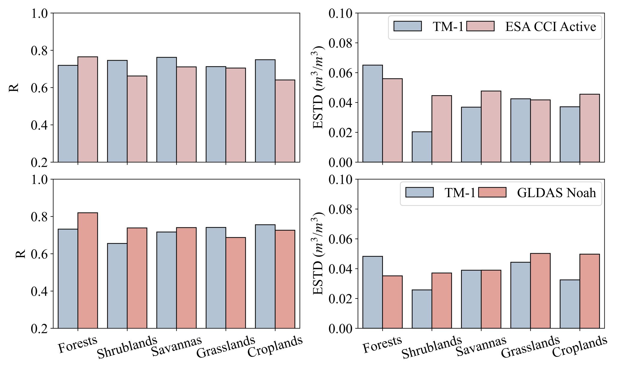 图2. TM-1和ESA CCI Active、TM-1和GLDAS Noah的不同地类的Triple Collocation验证结果