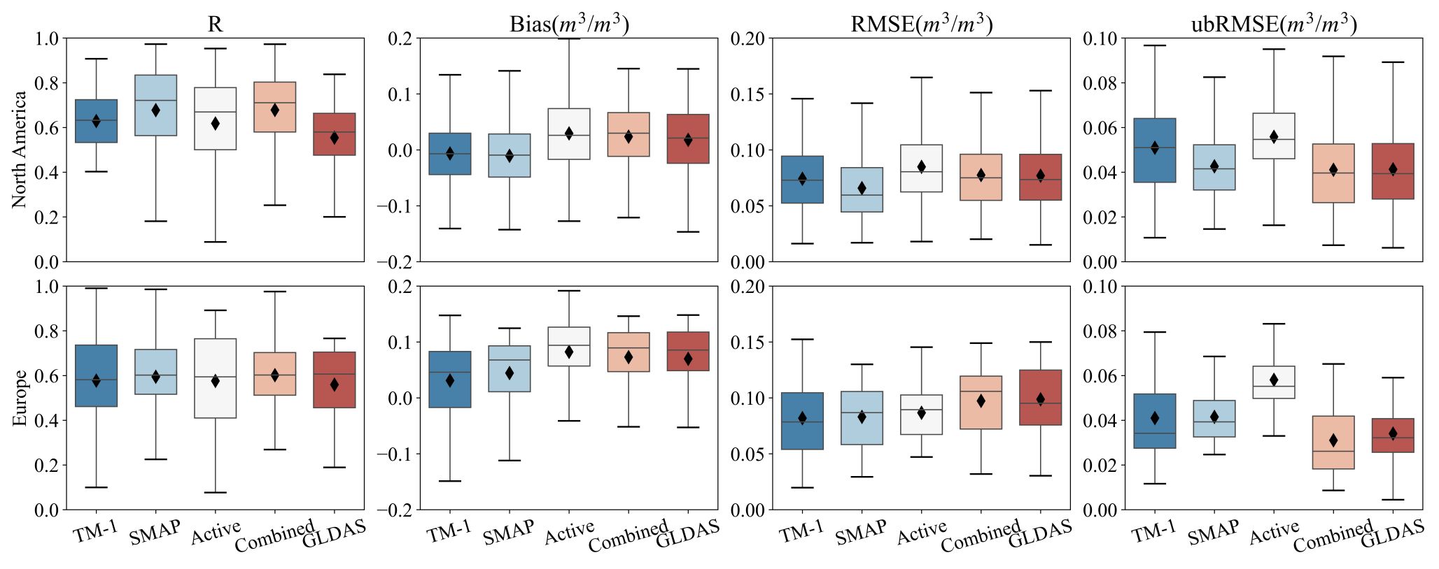 图1. TM-1、SMAP、ESA CCI Active/Combined和GLDAS Noah的原位验证结果