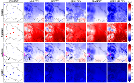 Figure 2. PWV distribution maps for GNSS, MLR, RF, GRNN, ERA5 and MODIS NIR in spring, summer, autumn and winter
