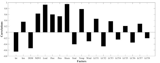 Figure. 1 Correlations among GNSS-derived PWV and coordinate, NDVI, meteorology factors, and topographic information, respectively (p<0 .01)