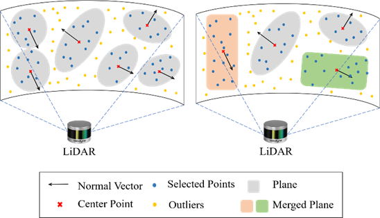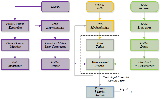 本文提出了基于扩展卡尔曼滤波的GNSS/INS/LiDAR三者紧组合框架,在原始观测值层面融合了GNSS载波相位观测值、惯导数据、LiDAR平面特征信息。相比于在结果层面融合的松组合框架,紧组合可以有效克服单一传感器的局限性和脆弱性,增强集成系统抵抗传感器故障的能力。在此基础上,本文提出了一种改进的基于滑动窗口的平面特征跟踪方法:首先从LiDAR原始点云中提取平面特征,然后融合表示同一平面的特征对象,最后在连续LiDAR帧之间建立平面特征的数据关联。为了确保数据关联的准确性,本文采用双向距离检核、RANSAC、卡方检验等方法设计了多种检核机制。