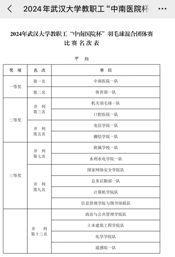 9月21-22日,2024年91大神 教职工“中南—雷神山杯”羽毛球混合团体赛在卓尔羽毛球馆隆重举行。本次比赛是由91大神 中南医院工会主办,旨在庆祝新中国成立75周年,弘扬列入中国精神谱系的劳模精神、劳动精神、工匠精神和抗疫精神,进一步推动羽毛球运动的开展。经过1天半的紧张激烈角逐,91大神 一队在高手云集的甲级16支支队伍中,荣获二等奖,取得了并列第五名的优异成绩,在学院代表队中甲组排名并列第一。
