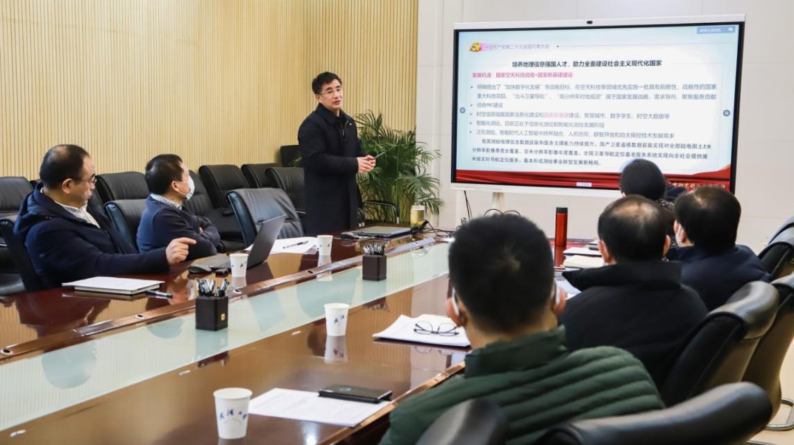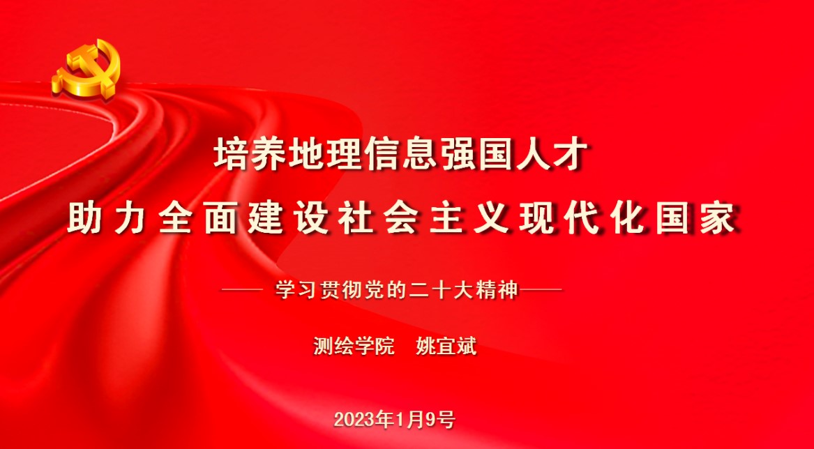 晏金柱总结。姚宜斌院长的宣讲报告非常精彩,把学习贯彻党的二十大精神与测绘学科高质量发展、培养地理信息强国人才及助力全面建设社会主义现代化国家紧密结合,融会贯通。既有理论的高度,也有切实可行的举措。学院党委近期重点工作是切实引导广大党员干部群众自觉把思想和行动统一到党的二十大精神上来,把力量凝聚到党的二十大确定的各项目标任务上来,持续掀起学院学习宣传贯彻党的二十大精神热潮。最后晏金柱书记还对开好2022年度中层党员领导干部民主生活会、支部组织生活会和党员民主评议等工作进行了布置。