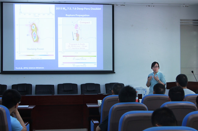 sai教授主要介绍了海啸传播速度的估计。Tsai教授带领大家一起推导了海啸传播速度公式,结合理论合成值和实际观测结果的差异,分析影响海啸传播速度的影响因素,Tsai教授的演讲互动效果良好,令人印象深刻的是他认为简单的模型也能得到非常重要、精确的研究结果。叶玲玲博士报告首先,简要介绍了深部大地震的一些基本知识和产生深部大地震的四种可能机制。最后,以“孤立的”Bonin地震、Peru地震对为例,说明了深部地震的能量释放和破裂过程的多样性。报告结束后,与会人员就感兴趣的问题与Tsai教授和叶博士进行了交流讨论。