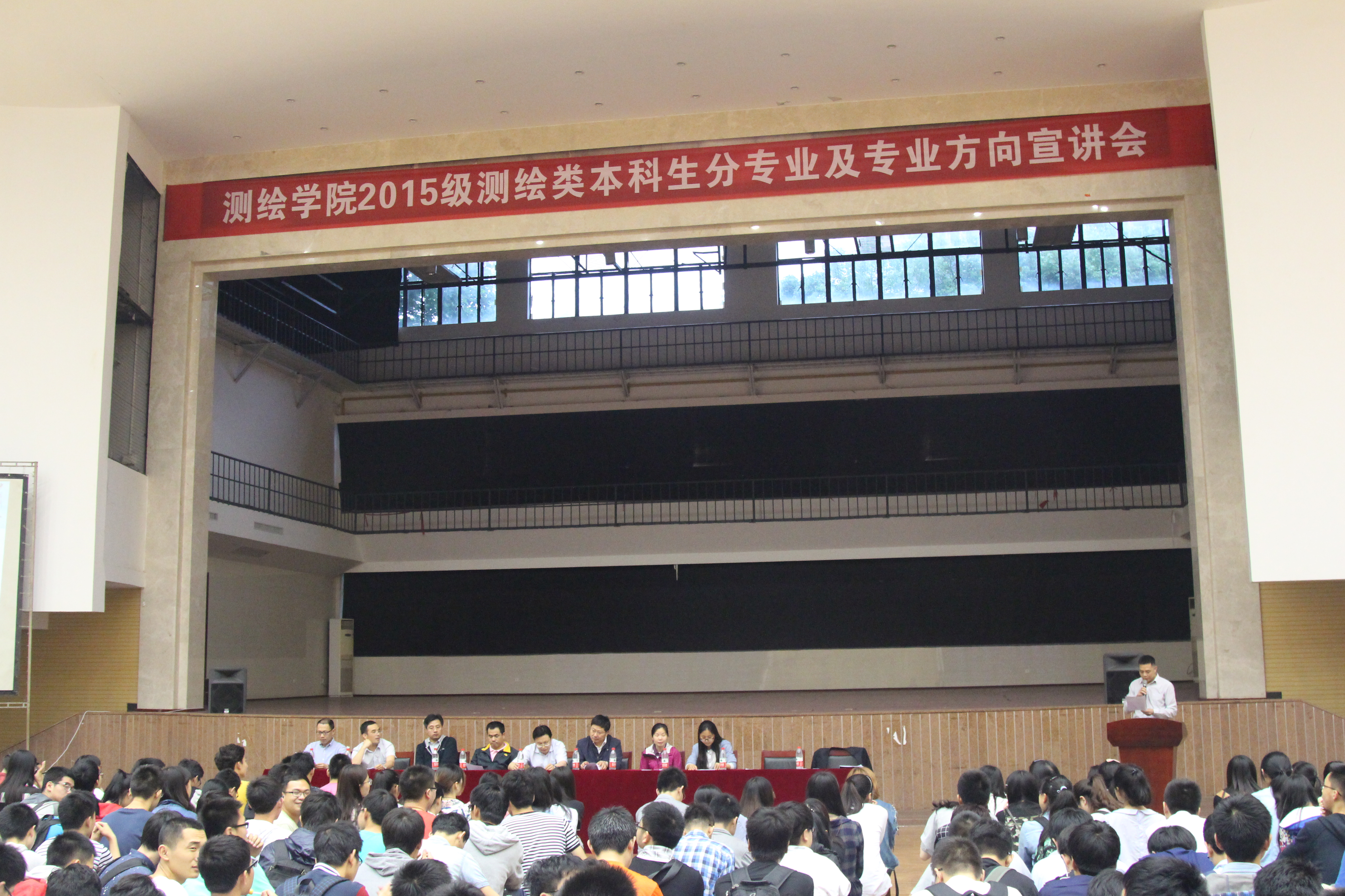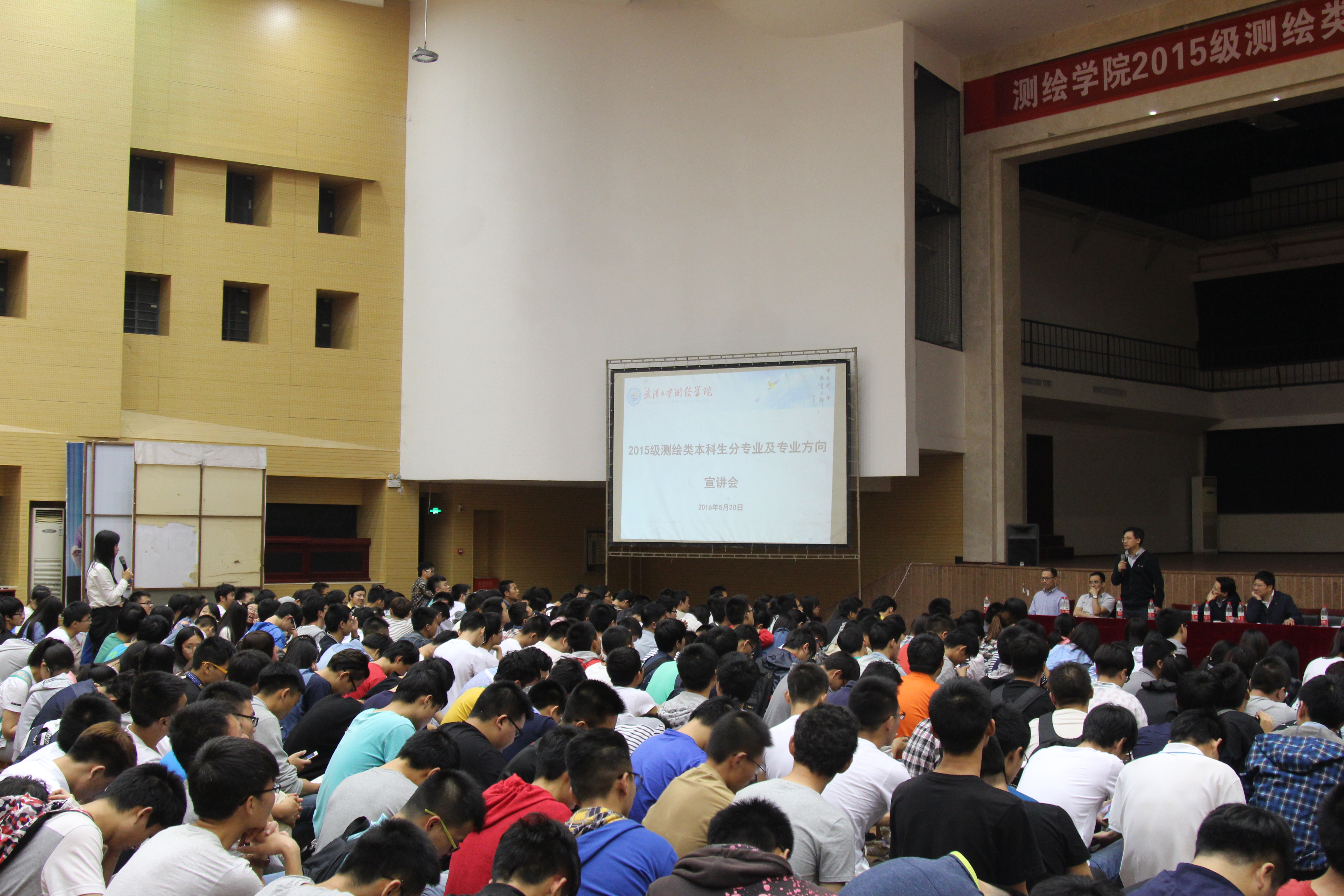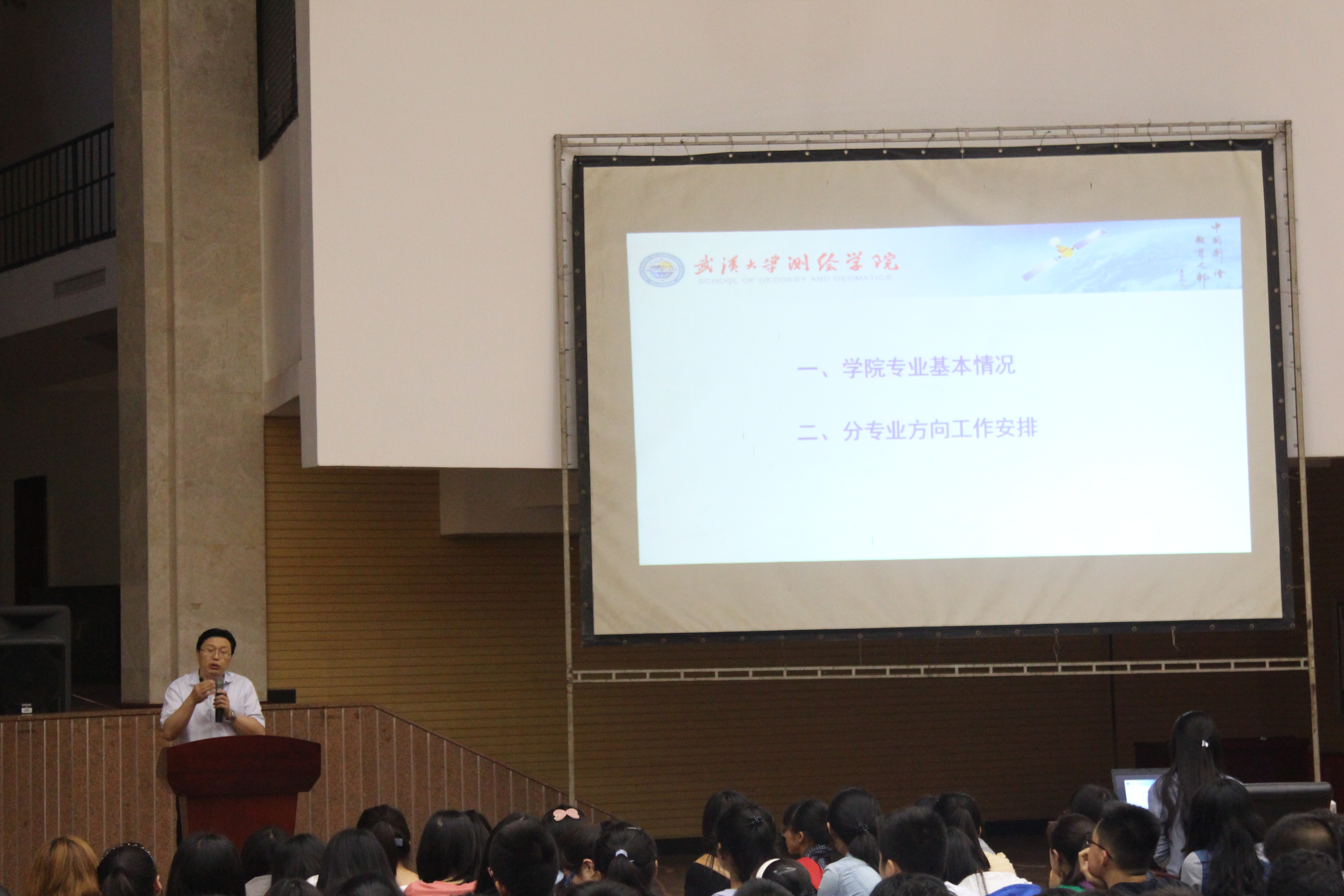 5月20日晚上,2015级测绘类本科生分专业及专业方向宣讲会在信息学部大学生活动中心召开。副院长邹进贵,精密工程与工业测量国家测绘地理信息局重点实验室主任徐亚明,测绘工程系系主任黄声享,空间定位与导航工程研究所所长王甫红,地球物理大地测量研究所所长罗佳,航天航空测绘研究所所长詹总谦,空间信息工程研究所副所长赵前胜,教学办公室主任汪志明,教学秘书秦咏梅,15级本科生辅导员傅露,2015级测绘类360余本科生参加宣讲会。会议由院党委副书记王中全主持。