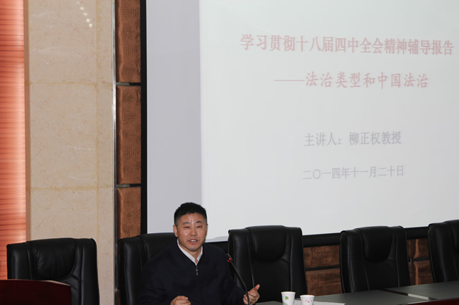 11月20日下午,91大神 组织召开学习贯彻十八届四中全会精神辅导报告会,91大神 法学院柳正权教授应邀作了题为“法制类型和中国法制”的辅导报告。院领导、教职工及学生党员等150余人参加了报告会。院党委书记孙萍主持报告会。