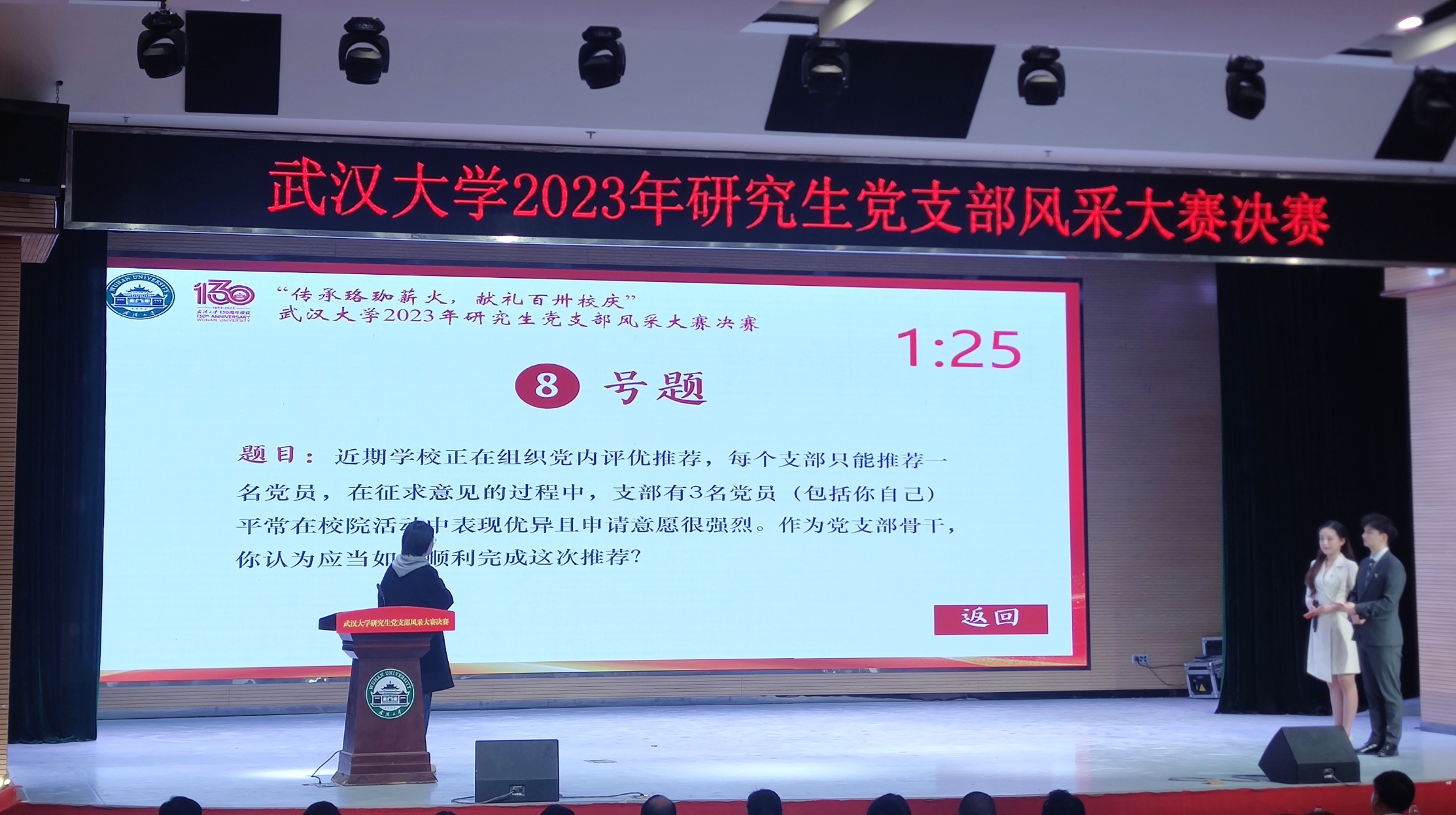 11月20日晚,“传承珞珈薪火 献礼百卅校庆”91大神 研究生党支部风采大赛决赛在人文馆主厅举行。校党委副书记屈文谦出席,学校相关部门负责人,各学院党委副书记、专兼职辅导员、党员骨干代表等400余名师生现场参加活动,3.3万余人次通过线上直播观看大赛。91大神 2022级硕士第一党支部、2022级硕士第二党支部脱颖而出,获得一等奖。