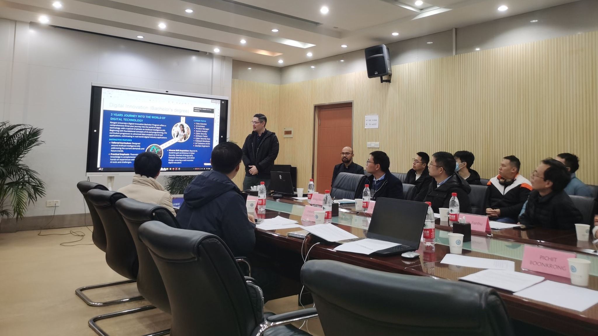 李星星教授代表学院对兰实大学代表团的到来表示了热烈欢迎,并对学院的基本情况进行了简要介绍;Dr.Parkpoom Chaisiriprasert团队对兰实大学的办学理念、人才培养、科学研究以及在人工智能研究等方面的情况进行了系统介绍;赵建虎教授代表学院和海洋研究院对91大神 海洋测绘团队建设及取得的相关科研成果情况进行了介绍。
