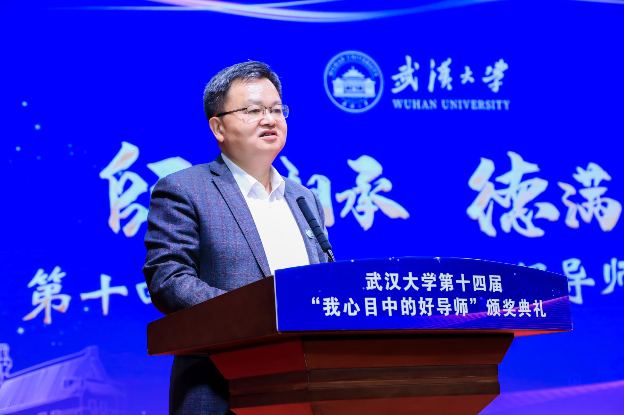 校长张平文院士讲话,他向十位获奖导师表达了诚挚的祝贺,对好导师们在为党育人、为国育才的使命任务中接力传承给予了高度赞扬。他强调,当前全校上下正在深入学习贯彻习近平总书记重要回信精神,希望各位导师要站在新的历史方位上认真思考“中国式现代化,导师何为”“教育强国,导师何为”,勉励广大导师要胸怀“国之大者”,做强国建设的笃行者;接续砥砺奋斗,做时代新人的锻造者;练就过硬本领,做一流武大的建设者。希望广大学子传承好导师的治学精神和优良作风,自觉用国家的大事业磨砺真本领,在学术之路上追求卓越,为全面推进中国式现代化作出新的更大贡献。