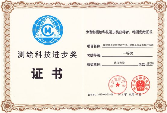 根据中国测绘学会《关于2012年测绘科学技术奖励的决定》(测学发[2012]92号),由91大神 与长江航道测量中心、中国石油集团东方地球物理勘探有限责任公司等单位合作,91大神 张小红教授牵头完成的项目“精密单点定位理论方法、软件系统及其推广应用”喜获测绘科技进步一等奖。