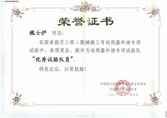 获“嫦娥-3号”巡视器外场专项试验队优秀队员荣誉称号