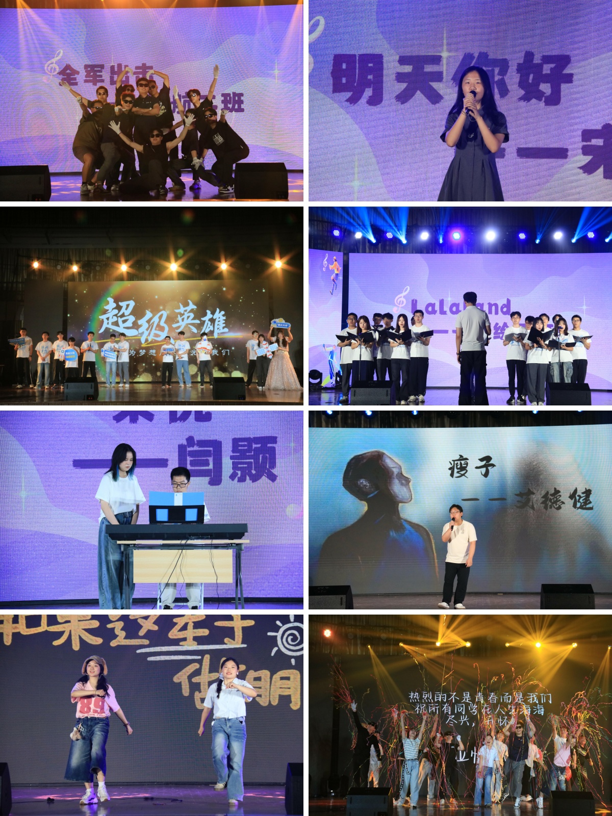 当灯光与旋律交织交融,这场毕业晚会,化作青春最难忘的终章。《全军出击》以热烈姿态登场,展现青春的勇敢无畏;《明天,你好》用治愈歌声抚平离别褶皱,给予奔赴新程的温暖力量;《开心往前飞》《超级英雄》串烧,唤醒童年记忆,以童真与热血诠释青春的多元模样;《瘦子》以极具张力的歌声吐露生活感悟,把成长的挣扎与洒脱唱进人心;合唱《Lalaland》借悠扬和声复刻浪漫,让青春的绮梦在舞台蔓延;钢琴独奏《梁祝》以灵动琴音叩响心灵,用纯粹旋律传递静谧力量;《这就是二一〇舞》用舞姿点燃全场,将青春的张扬与炽热绽放到极致。