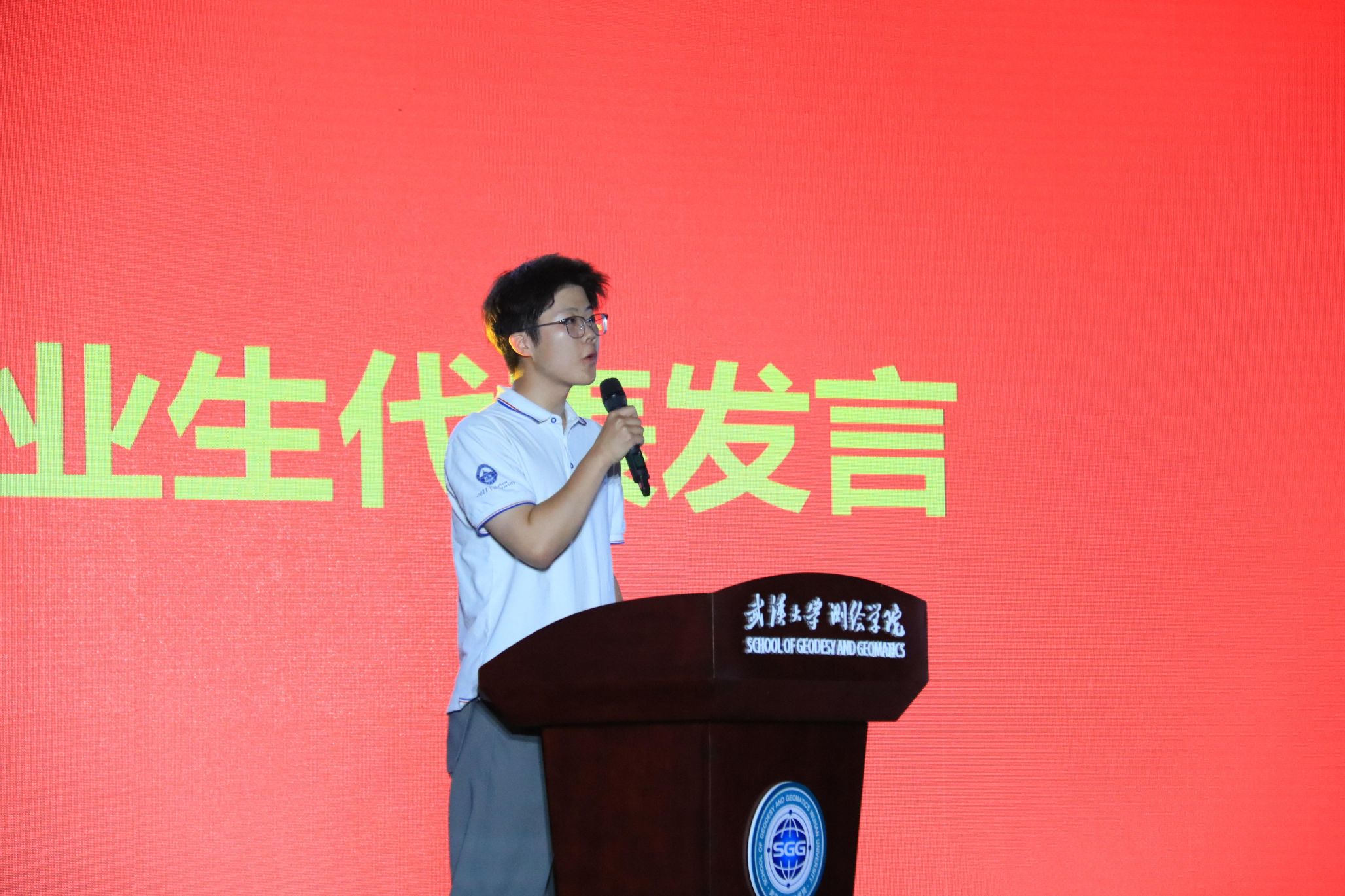 优秀毕业生代表发言。本科优秀毕业生代表黄俊同学结合自身成长经历,讲述了自己在学校和学院的培养和引导下,逐步从未知走向热爱,度过了最灿烂的四年大学时光。优秀毕业研究生代表李圣雨以十年珞珈岁月为轴,分享从测绘工程到北斗导航的学术征程,道出“测绘精神让精密坐标有了人文温度”的深切感悟。