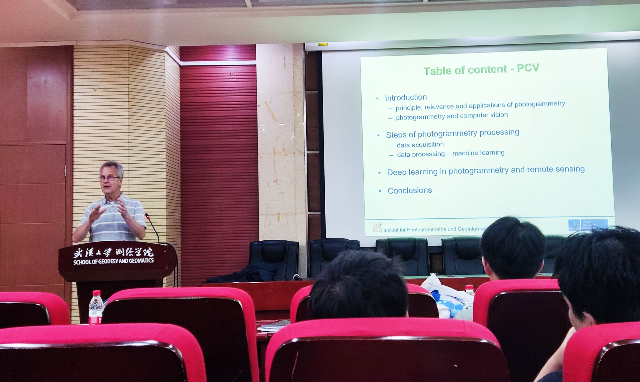 作为上一任ISPRS主席(2016-2022),Heipke教授首先为大家梳理了目前国际摄影测量与遥感协会的组织与构成,并对当前由中国学者负责的专题委员会做了简单介绍。针对目前摄影测量与计算机视觉的交叉问题,heipke教授就这两门科学所针对任务类型的异同点做出了解释。随后,heipke教授以摄影测量、遥感数据获取为出发点,介绍了相关的数据处理技术,以及产品生成,对摄影测量中完整故事线进行了详细介绍。此次报告中,针对数据处理中的几个关键技术和步骤,heipke教授就深度学习相关技术在其中的应用做了介绍,例如:就倾斜摄影测量中特征提取与匹配困难的问题,大倾角影像匹配中局部patch存在不确定的仿射变换关系,介绍了一种基于有监督学习的CNN方法并用于预测匹配patch之间合理的仿射变换,提高了大视角倾斜影像的匹配质量;针对密集匹配中深度信息变化剧烈的匹配退化及匹配可靠性问题,分别介绍了其课题组在基于深度学习模型提高视差图质量和预测密集匹配不确定性的相关研究。此外,针对摄影测量研究被摄物体特性、属性的问题,heipke教授介绍了一种可以提高土地覆盖分类任务精度的改进U-NET模型;针对土地利用中存在的同一土地覆盖属性可能存在不同利用类型的问题,介绍了一种由粗到细的分层预测网络模型。