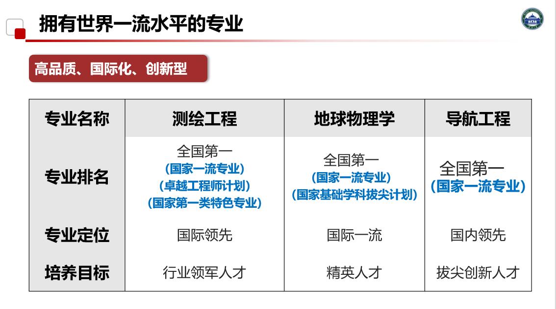 测绘类专业达到了国际领先水平,旨在培养领军型人才,导航工程达到了国内领先水平,旨在培养拔尖创新型人才,地球物理学具有国际一流水平,旨在培养理论研究的精英人才。学院师资力量雄厚、学科平台齐全。拥�60多名国家级高层次人才,建成了数十个国家、国际、省部级科研平台;学科方向全靀研究成果显著�2019�2020�2021连续三年获得国家科技进步奖一等奖,近几年还获得了国家科技进步奖二等奖4项,省部级科技奖项超过百项;教学成果丰富、人才质量优良。学院打造了系列名师课堂�6位院士为本科新生讲授《测绘学概论》,被教育部树立为教学标杆�